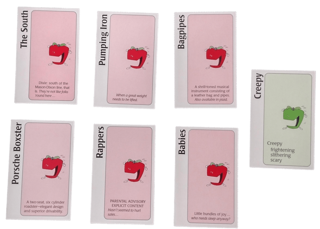 Apples to Apples unfolds with each player holding a hand of seven red cards, each bearing the name of a person, place, thing, or event. The heart of the game beats with the green cards, each describing a characteristic or emotion. In every round, one player, the judge, draws a green card and shares its adjective with the group. Below lies examples of green cards, like leaves, scattered across our path, each one holding a story.