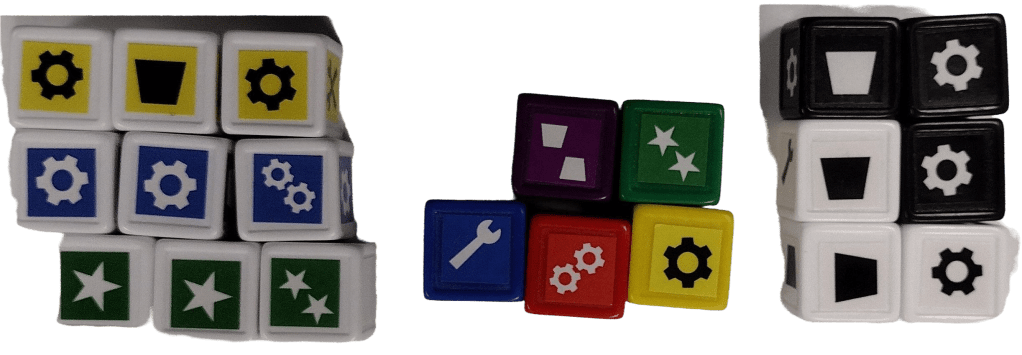 Each player picks a role, like being the Specialist, and trust me, it’s neat to see the unique stuff each role can pull off. When it’s your turn, you’ll roll a mix of 6 dice – 3 white, 2 black, and one special die that’s all about your gnome’s job. The dice decide what resources you’ve got on hand, and from there, you can either take a chance and re-roll or use what you’ve got to grab components. These components are the bread and butter of your machine, and you’ll need Gears or Teeth (yep, you heard that right) to get them. Below are examples of the different dice in the game.