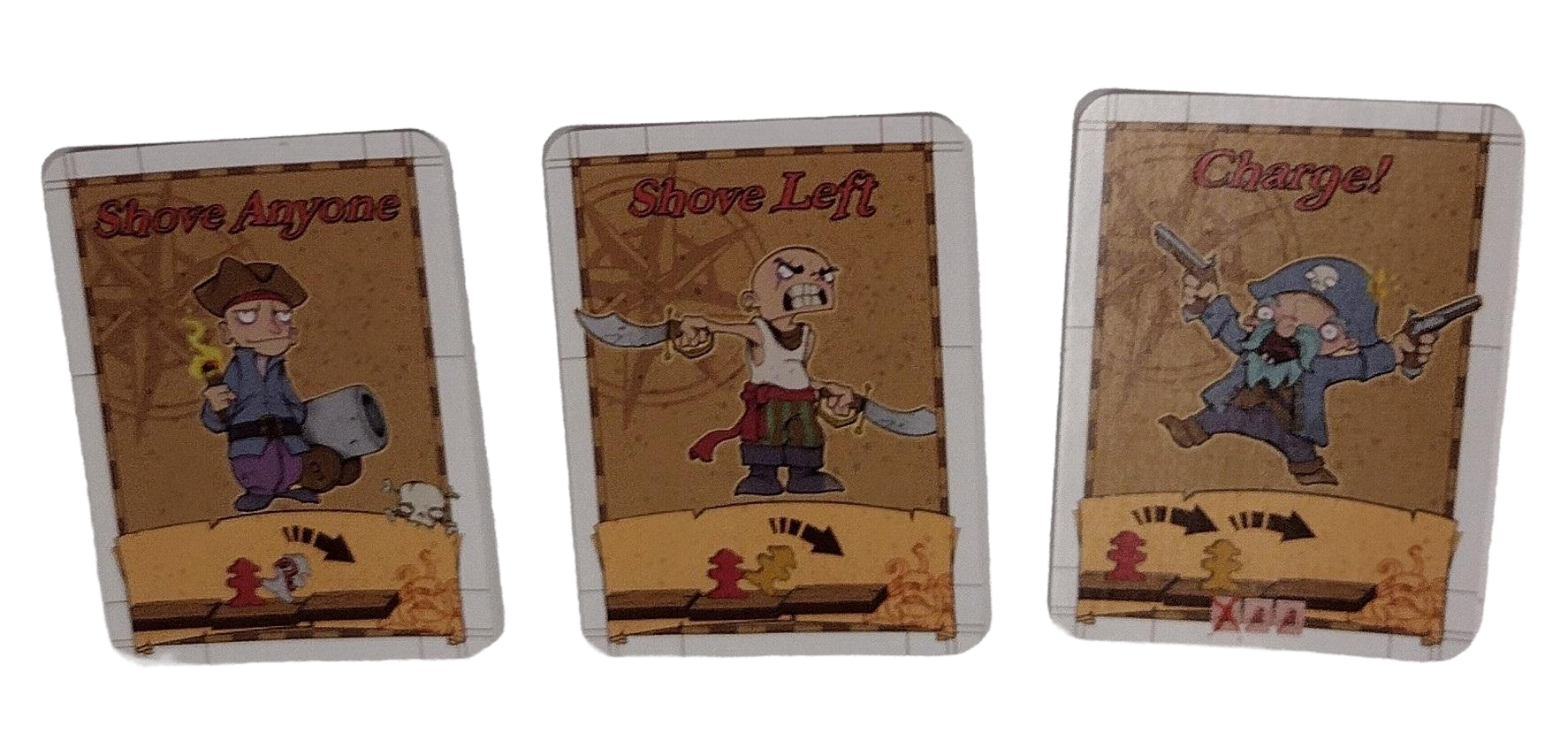 Everyone gets three pirate figures, and we all try to keep them safe on the ship. The game has special cards that tell your pirates what to do, like moving forward, pulling another pirate back, or even making pirates bump into each other and both getting closer to the water!