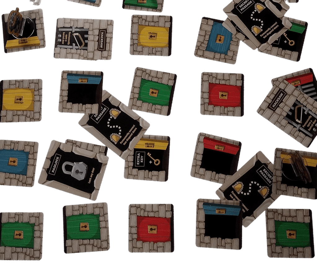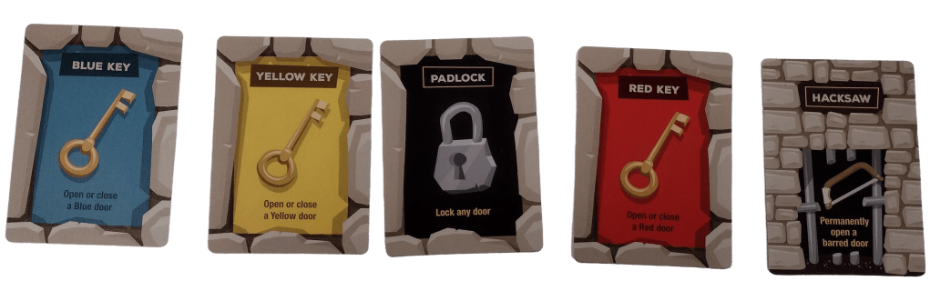 The above cards are the type of cards in the deck. A red key unlocks a red door, a padlock will lock any door and a hacksaw opens a bared door. Sometimes there will even be secret passages that allow players to move diagonally. The heart of this charming quest is in the clever use of key cards to unlock doors, each successful match allowing us to lay down a path card and move closer to victory. But ah, the castle is full of surprises! Special action cards bring twists and turns to our journey. Maybe a door suddenly swings shut, or a bridge extends, offering a new route previously unimagined.