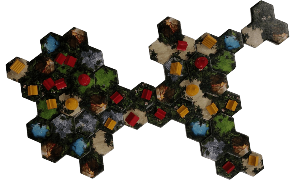 This weekend I played a new game. In Taluva, we find ourselves as rival tribes, in an ever-changing island landscape. The heart of the game lies in its tiles, each one a piece of the island’s terrain—volcanoes, jungles, lakes, and more, waiting for us to shape its destiny. The setup is a breeze, a canvas of possibility laid bare before us, with only the island’s first volcanic peak breaking the horizon.