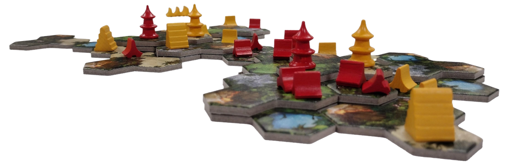 But Taluva is more than a game of beautiful destruction; it’s a dance of expansion and elevation. As we build, we also seek to establish our settlements—huts, temples, and towers, each a testament to our tribe’s presence and power. The challenge lies in choosing when to spread out across the fertile ground or when to build upwards, reaching for the skies to claim the higher ground. This is how the levels add to the settlement’s elevation.