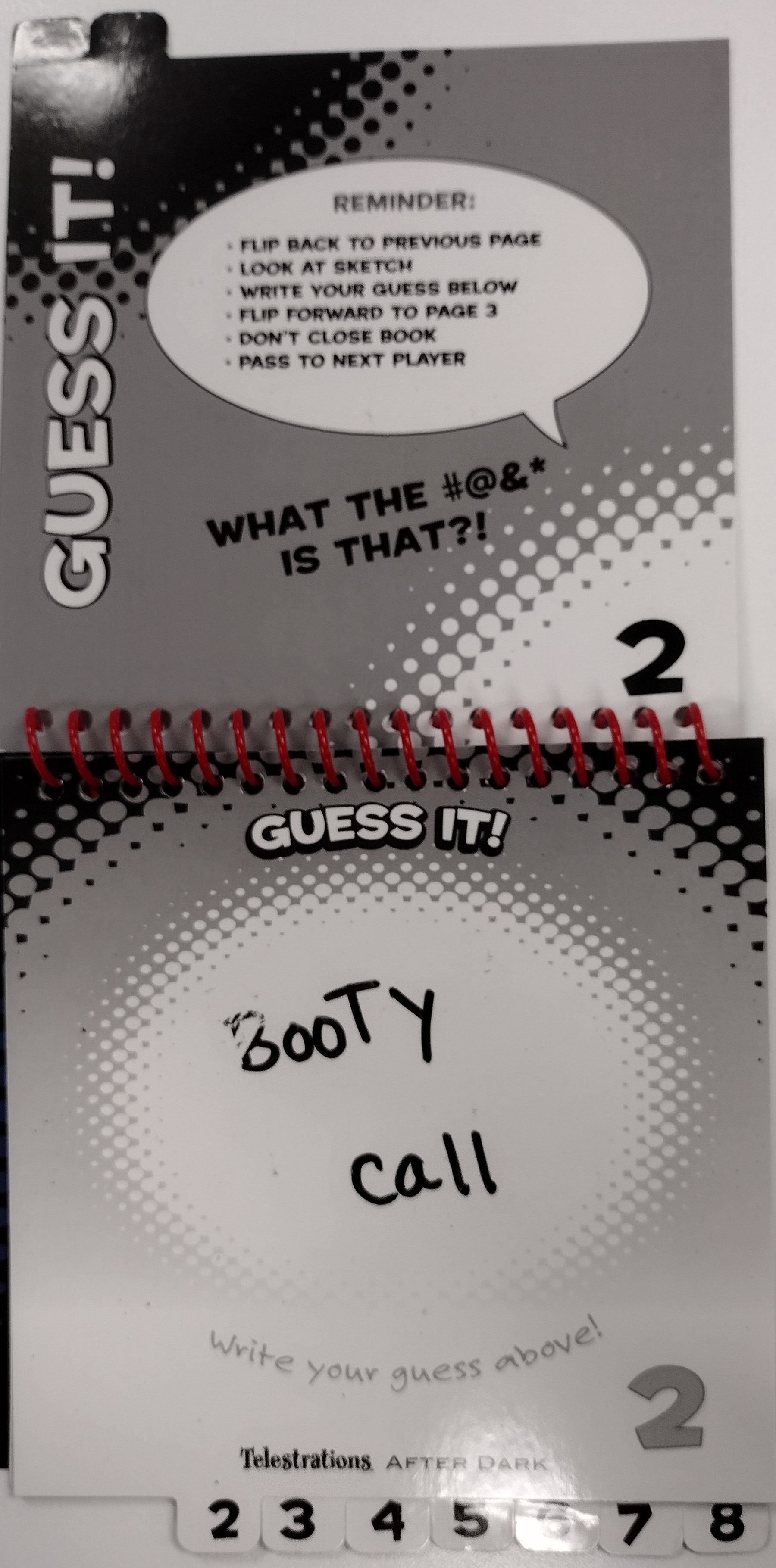 Here is the card I had to choose from. I will show my book of drawing and guesses for Booty Call.