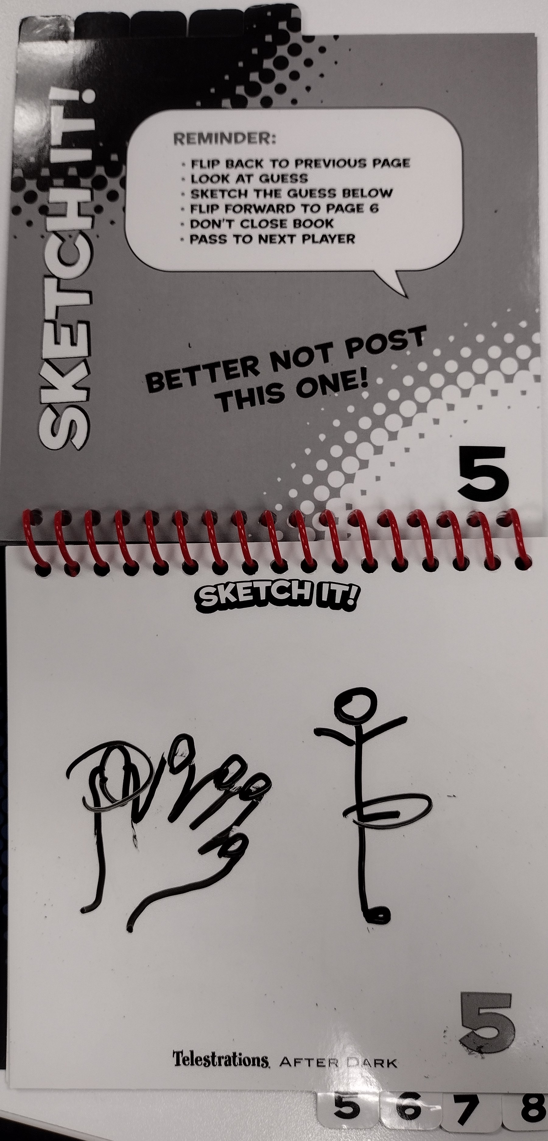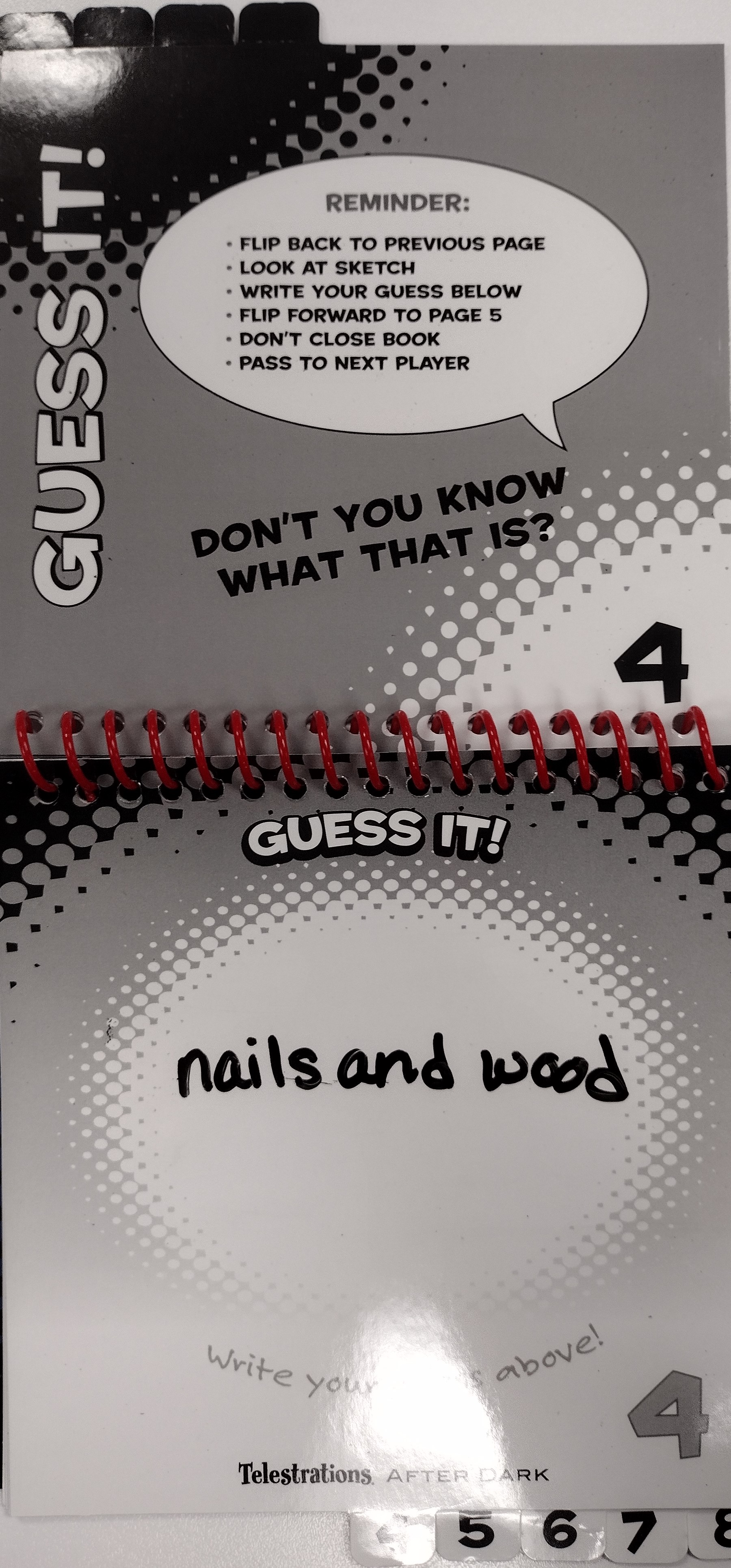 Playing Telestrations: After Dark was like opening a box of laughter potions, each round casting a spell of hilarity that had us clutching our sides. It’s a game that doesn’t just break the ice; it melts it away with the warmth of shared amusement and the glow of friendships illuminated under the mischievous moonlight. The final guess is Nails and Boner. This game of “telephone” shows how messages can be confused when going from one person to another.