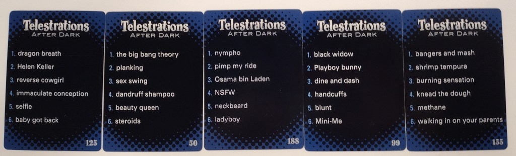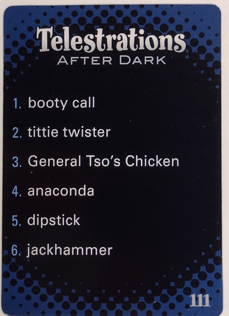 Telestrations: After Dark is like a secret passed through the shadows, where each player begins with a word or phrase from the game’s decidedly grown-up theme. Armed with a drawing pad and a marker you have to interpret the previous player’s message. Here’s the catch: no words or numbers allowed in your masterpiece, only your artistic prowess. Here are examples of words you might encounter.