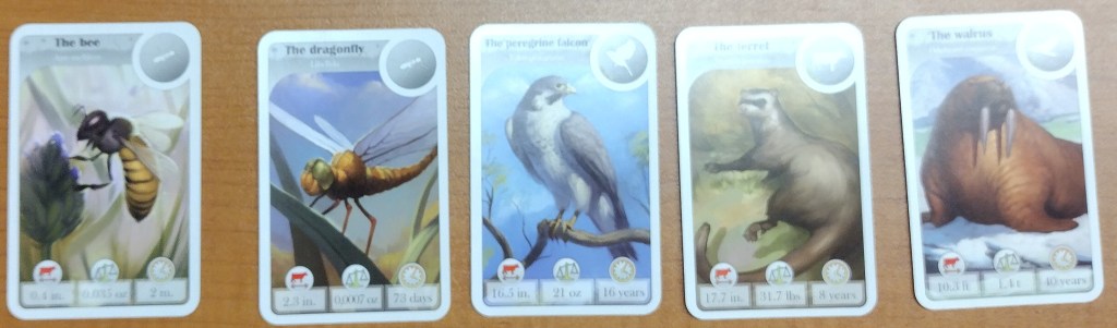 The true magic of Cardline Animals lies not in the beauty of its artwork, but in the challenge it poses. The task? To weave these cards into a growing timeline, placing each animal in its rightful place based on size, weight, or lifespan. This is chosen before playing. Each player takes turn placing them in the correct order for the chosen measurement. Here is an example from a recent game. We had three cards in order and then we tried to put the llama in order, but it was out of order since length is 6.2ft, 8.2ft, 8.7ft and the llama was 4.1ft.