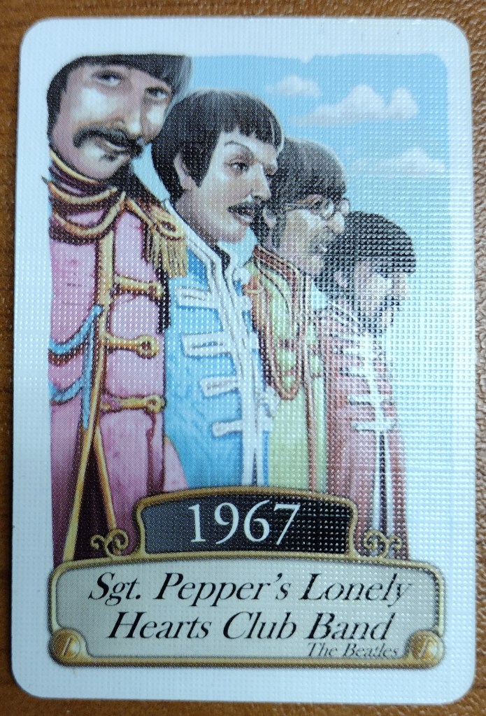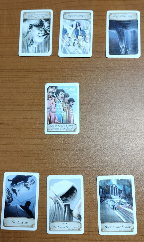 Timeline: Music and Cinema is a card game where you build a timeline with songs or films. One side of the card reveals the event or creation, while the other side, hidden from view, bears the year it graced the world. The stage is set with a single card placed in the center, its date revealed as the starting point of our journey through time. In my case, the starting card was St Pepper’s Lonely Hearts Club Band.