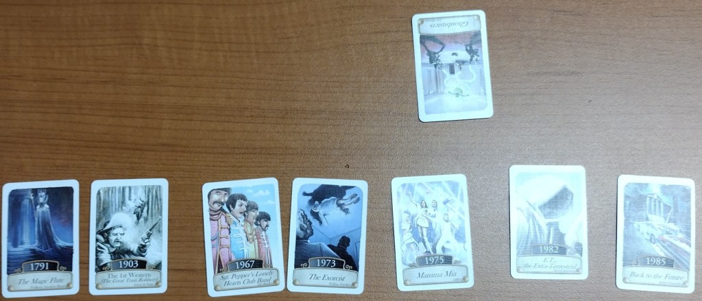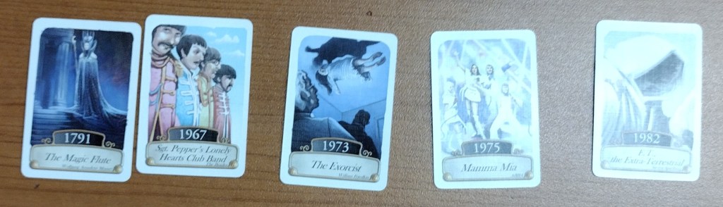 Timeline: Music and Cinema has brought some fun to our evening. Each card, a gateway to the past, invites us not just to play but to remember, to share stories and spark conversations about the songs that moved us and the films that left us in awe. It’s a game that transcends competition, becoming a celebration of our collective cultural heritage. This was our starting hand.