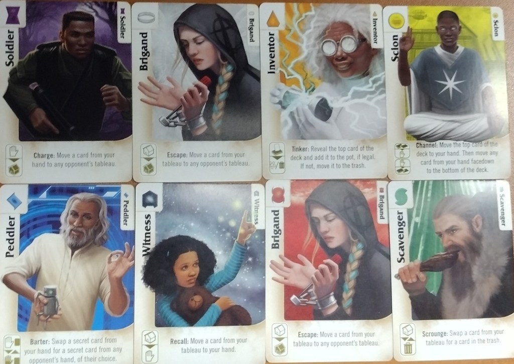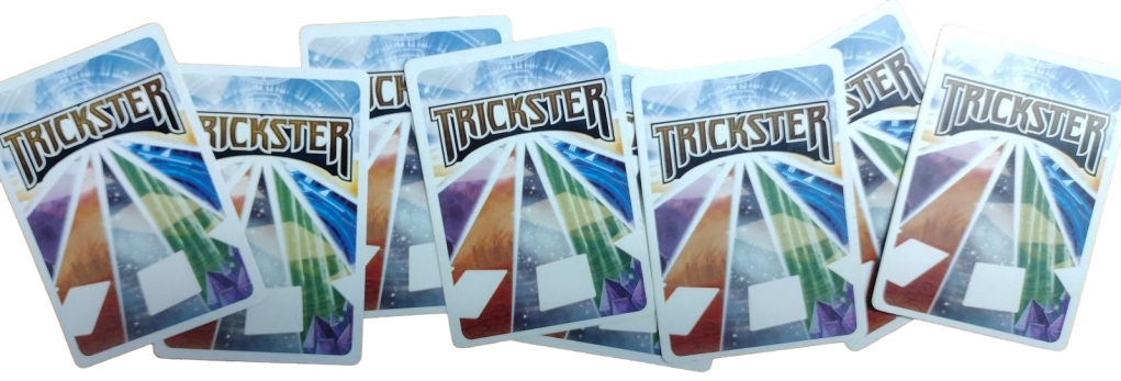 Trickster: Champion of Time is a game where cunning meets whimsy across the multiverse. In this world, we are legendary tricksters, darting through ages, dodging heroes who dare to chase us across the fabric of reality itself. Our mission is to be the craftiest of all, weaving through troubles with the finesse of a shadow, leaving behind a trail of bewilderment and admiration. The tableau is a bit too large to photograph in a way that would do it justice, but here is a photo that shows the variety of the cards.