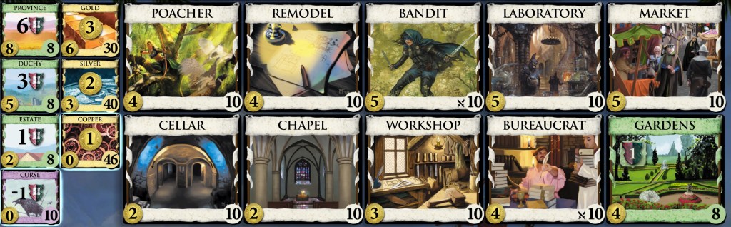 Dominion, what a splendid tableau of strategy and empire-building it presents, all within the confines of our tabletop kingdoms! I recently ventured into its digital realms against a computer opponent set to Easy, a delightful foray that reminded me why this classic holds such a revered spot in the pantheon of deck-building games. Here are the chosen Action cards all of which are from the base set.