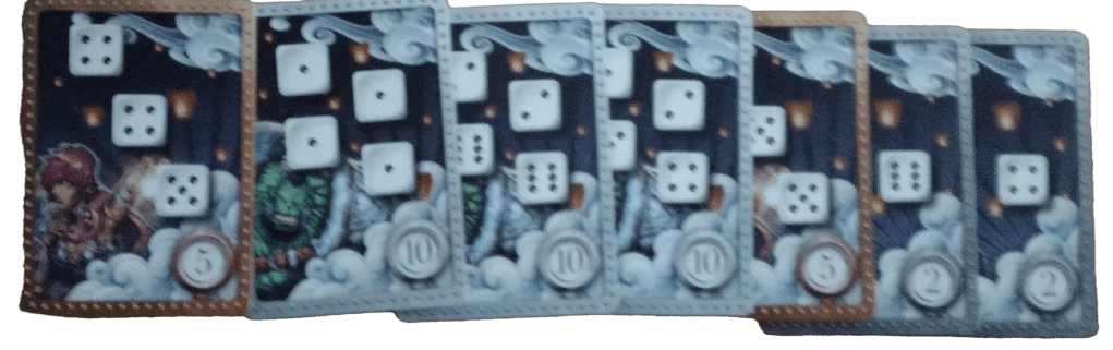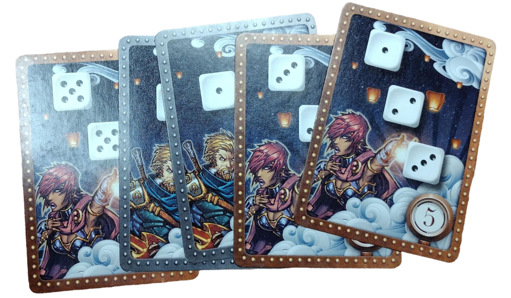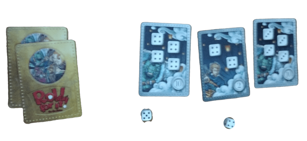 Each player receives a set of dice, and cards are laid out in the center of the table, each card displaying combinations of dice needed to claim it. On your turn, you roll your dice and decide which card(s) you want to attempt to match by placing your dice on them. If you can’t match a card completely, no worries! Your dice stay there, waiting for your next turn to try again. The first player to reach a set number of points from claimed cards wins.