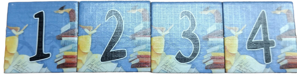 After hearing the clue, other players choose one of their own cards that best matches the Storyteller’s description and submit it face down. The Storyteller shuffles all received cards and reveals them. Players then vote on which card they believe was the Storyteller’s, but cannot vote for their own card. Here are my voting tokens.
