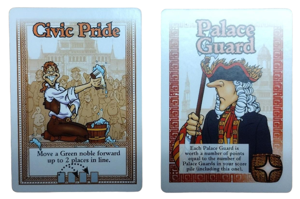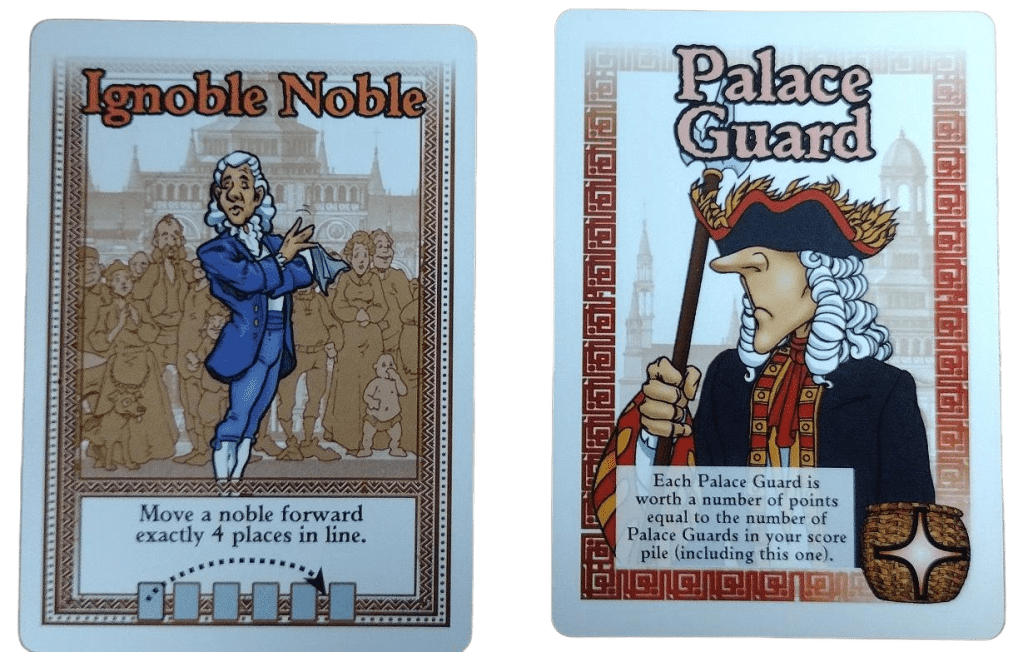 To maximize points with Ignoble Nobles and Palace Guards, use Ignoble Nobles to increase the value of low-scoring nobles and maximize the points of multiple Palace Guards. With this combination, even seemingly weak nobles can score big, disrupting other players’ expectations and creating a substantial point boost.