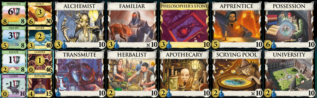 Dominion: Alchemy on Steam breathes new life into the familiar deck-building dynamics of Dominion with a magical twist. This expansion is beautifully integrated into the digital platform, offering seamless gameplay and intuitive controls that make managing your growing deck a breeze. The alchemy theme is woven through each card and mechanic, enhancing the game with both thematic depth and strategic complexity. Here are the cards in my game.