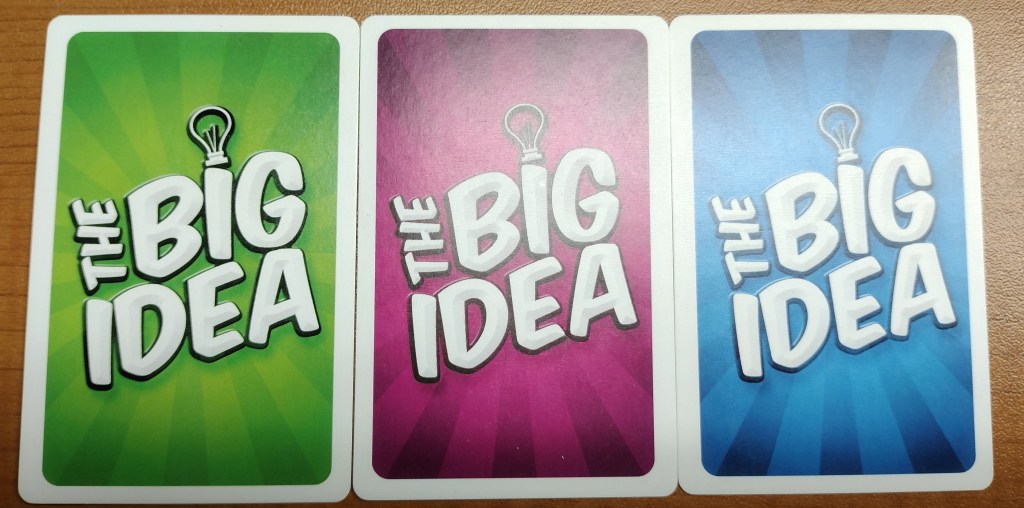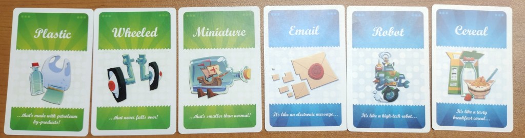 The box comes with three types of cards. The green Description cards, The purple Vote cards and the blue Item cards. To setup The Big Idea you deal out three of the Item cards and three Description cards—each brimming with possibilities, from the mundane to the outright bizarre. Here are the cards I got in the first round.