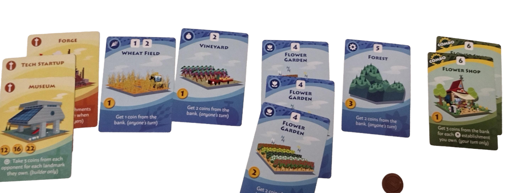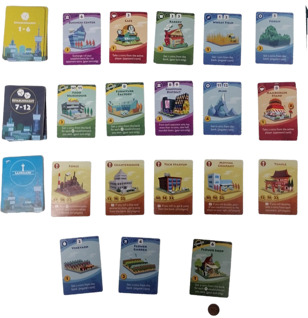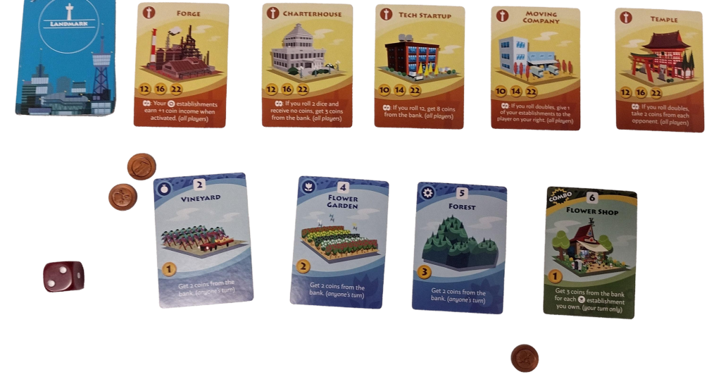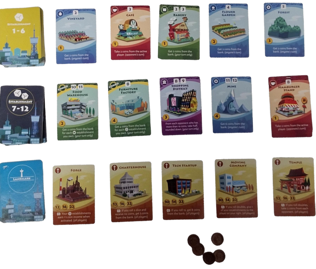 Here’s how our adventure begins: each player starts with 5 coins. The first three turns are spent buying businesses. Your goal? To build landmarks and develop your city before your rivals do.