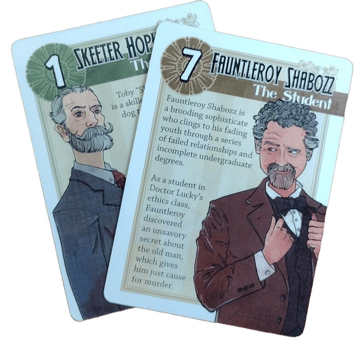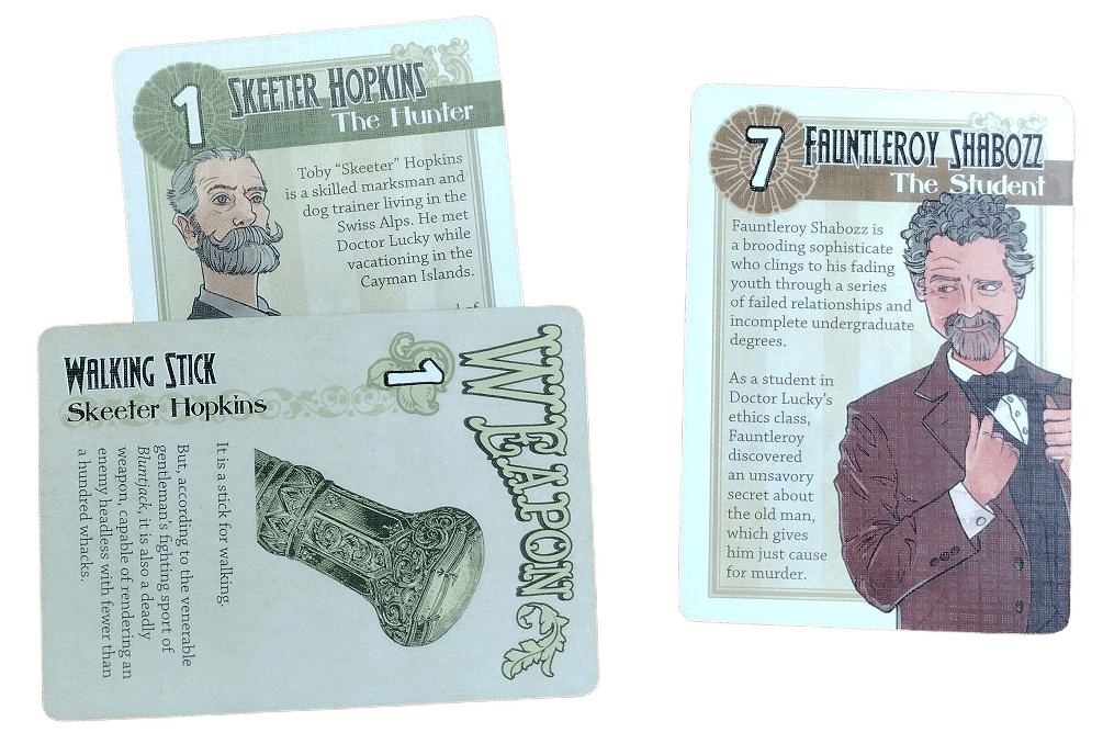 Oh, what a cheeky little game Get Lucky turned out to be! It’s a card game adaptation of the ever-popular Kill Doctor Lucky, and it perfectly captures the wily intrigue of trying to off the good doctor without getting caught. The game box comes packed with an amusing assortment of character cards and luck cards—each one beautifully illustrated to add to the game’s whimsical, nefarious feel.