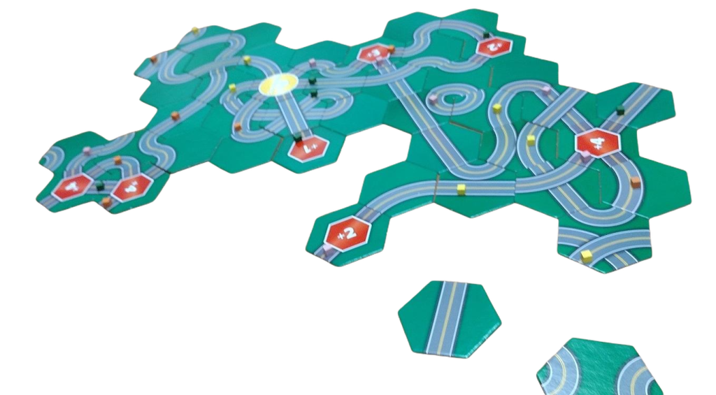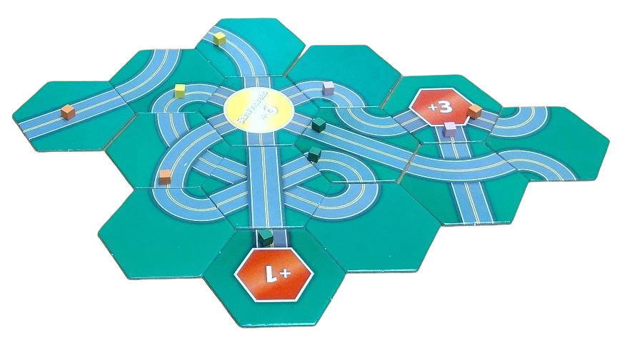 The game ends when all tiles are placed or when the board’s potential has been fully tapped. Points are scored based on complete highways marked by your crew, with extra points for intersections and clever connections. Notice in the photos the tiny wooden cubes.
