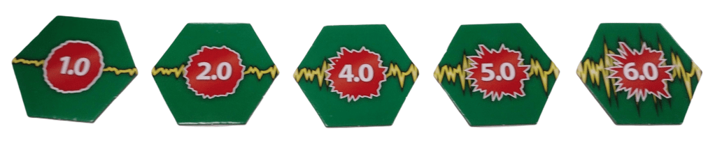 There are 6 quake tiles that simulate the tremors and aftershocks. There are also 80 tiny wooden cubes that represent the road crew markers.