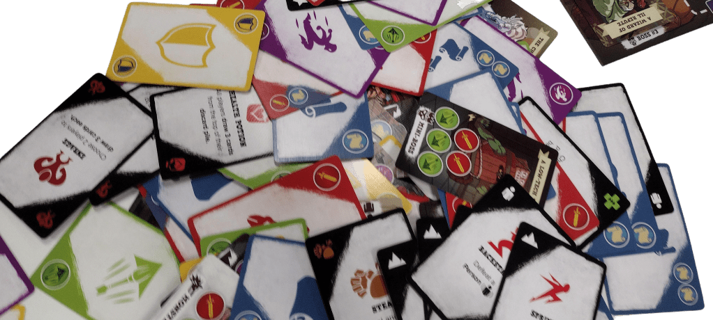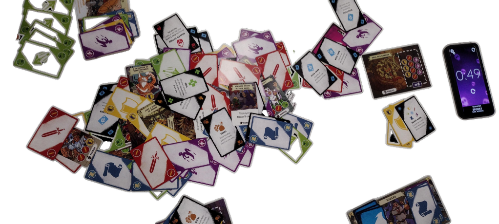 Gameplay is intense and exhilarating, making each round a race against time. Special cards like Event and Challenge cards spice things up, sometimes requiring immediate action or presenting tougher foes that require more symbols to defeat. The game is divided into two parts: navigating through the dungeon and confronting the boss, each demanding quick thinking and rapid responses. Here is the giant pile of cards after defeating the dungeon. We had 49 seconds to spare.