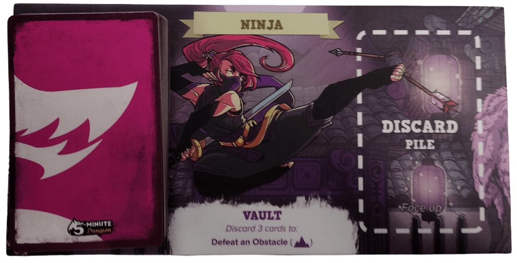 In the game of 5 Minute Dungeon, you and your friends transform into heroes, each with a unique deck and abilities, to navigate through swiftly-paced dungeons. The game setup begins with each player selecting a hero and shuffling their corresponding deck to form their draw pile, from which they draw a starting hand. I chose pink and this character had a special power to defeat an Obstacle if I discarded 3 cards.