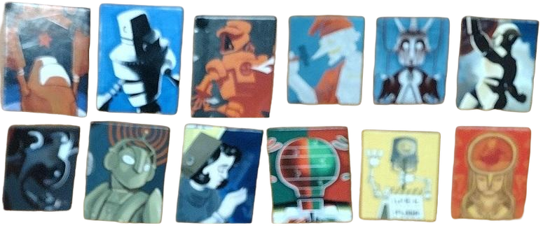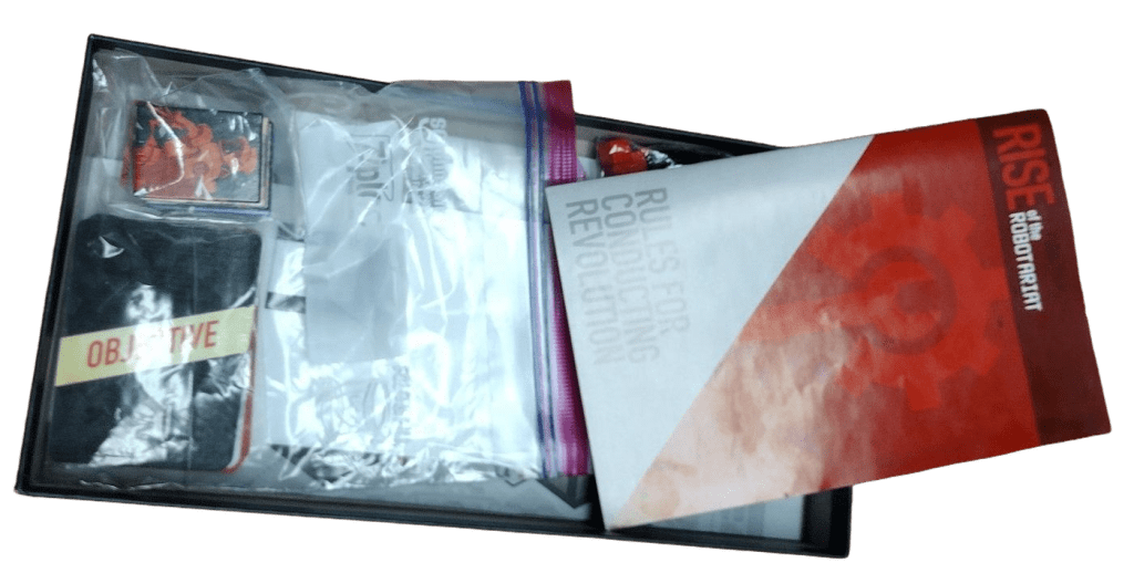 Character Cards and Standees: Choose from 11 different robots, each with unique abilities. NPC Pieces: These include 3 Black (Human Oppressors) and 3 Red (Civilian Robots) which interact with the players throughout the game.