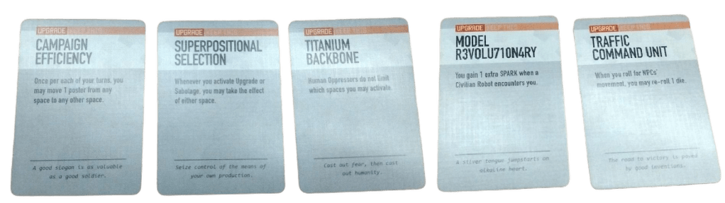 Dice: One red for Civilian Robot movement and one black for Human Oppressor movement—because even robots rely on a bit of chance! Various Decks: Including Upgrade, Sabotage, and Secret Objective decks which add depth and unpredictability to the game. Here is an example of the upgrade cards.