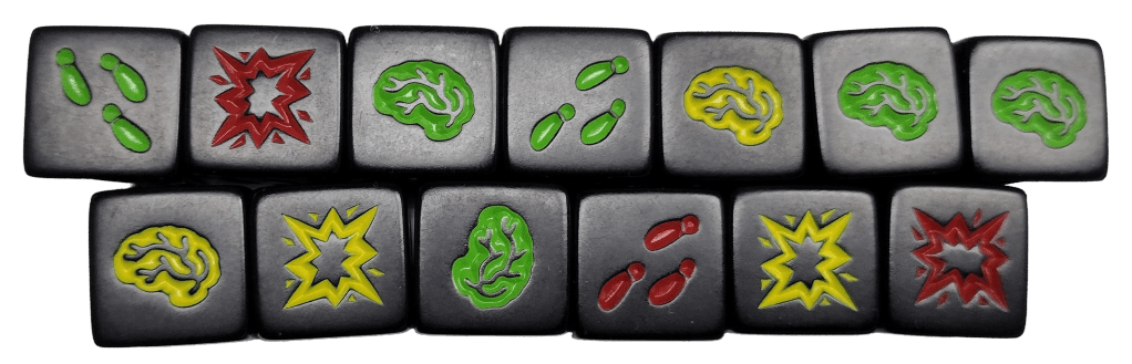 Let me take you through a round: I start by shaking the can and drawing two green dice and one yellow. The roll reveals a brain, a footprint, and a shotgun blast—tempting but risky. Eager for more brains, I decide to pull two more dice, keeping the total at three.