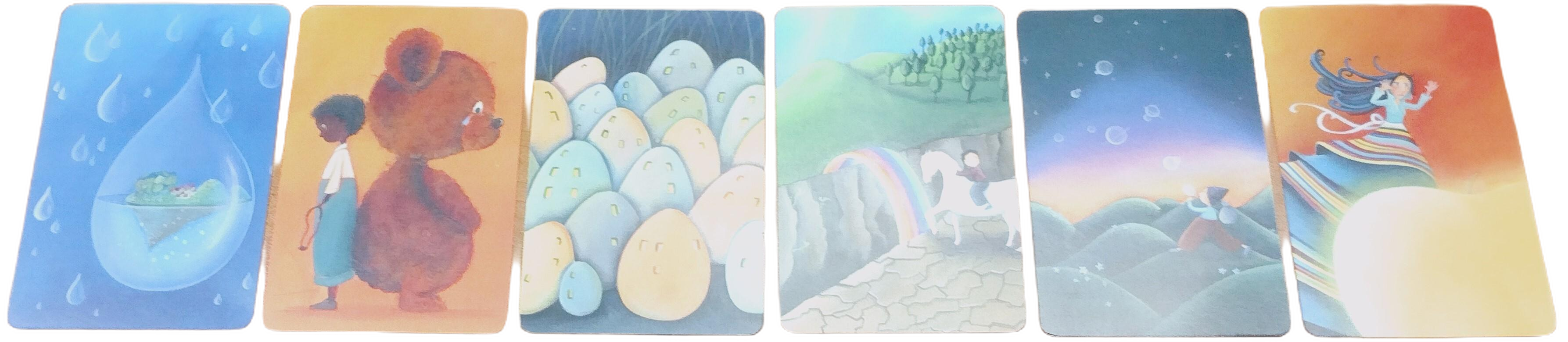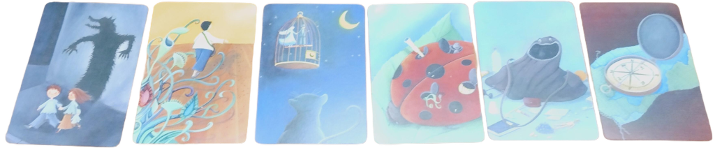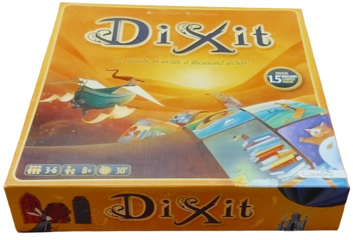 Dixit, housed in its charming orange box, is a delightful board game that transports players into a world of abstract storytelling and guesswork. The game is designed for 3-6 players and typically takes about 30 minutes to play. Each player receives a hand of six beautifully illustrated cards, each unique in its dreamlike imagery. Here are a few cards; notice the beautiful artwork.
