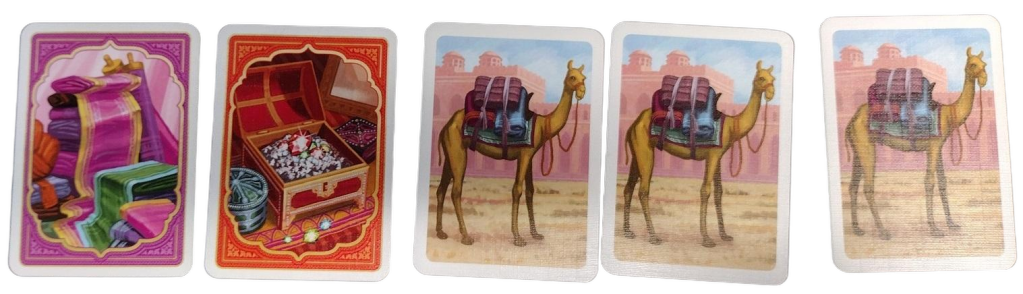 To sell, you discard goods cards from your hand and take the corresponding number of tokens from the stack. The more cards you sell at once, the higher your reward. To start, place three camels on the table.