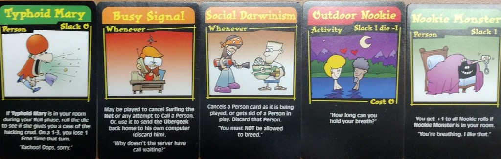 I just played Chez Geek by Steve Jackson Games, a card game that perfectly captures the chaos and humor of shared living. In Chez Geek, each player takes on the role of a roommate in a shared apartment, with one simple goal: to accumulate the most Slack points. You do this by indulging in leisure activities, buying cool items, and interacting with your fellow roommates. Here are some examples of the job cards you’ll encounter: