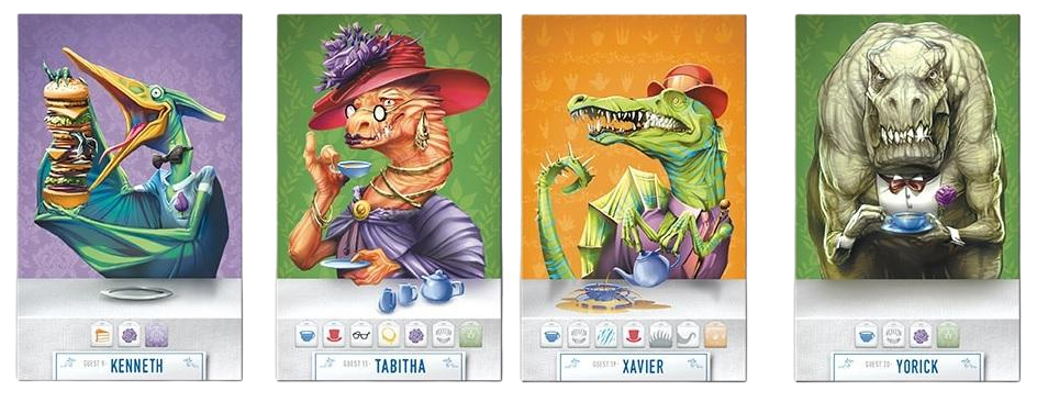 Each player receives a hidden character card, representing one of the dinosaurs at the tea party. The character cards include fun illustrations and details about each dinosaur’s likes, dislikes, and distinguishing features.