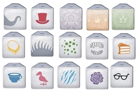 There is a central display of trait cards that show various characteristics, such as “wears a hat”, “has glasses”, “drinks tea”, “Is in a purple room” and more. These traits correspond to the different characteristics of the dinosaurs. Each player is also given a set of tokens or markers that they will use to keep track of the answers they receive during the game. These are the tokens above.