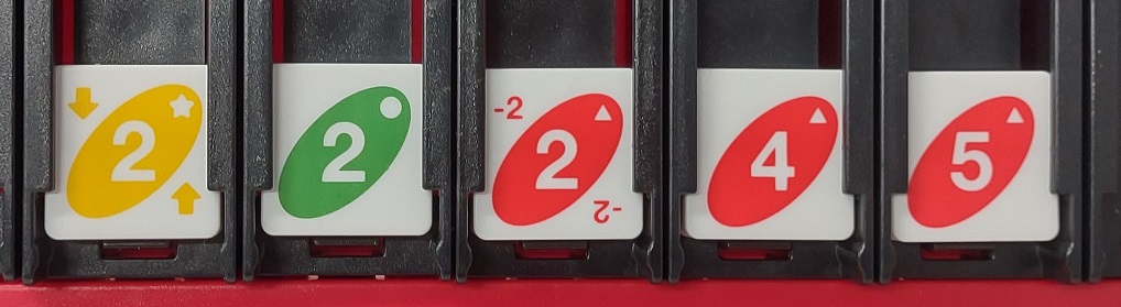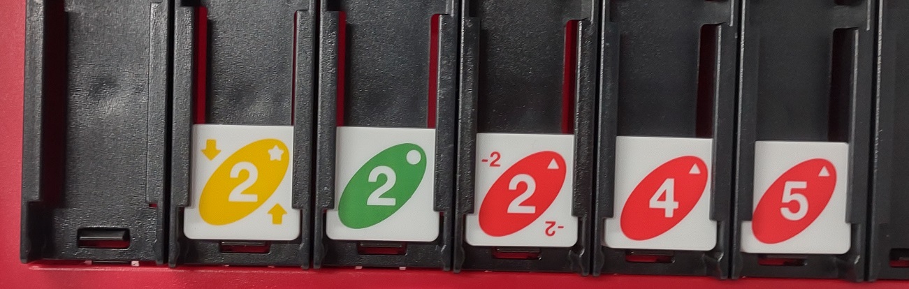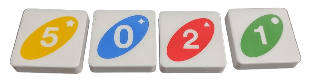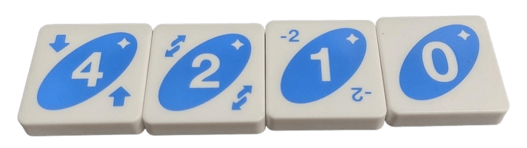 These tiles, are pretty special, and I refer to them as superpower tiles. The 4-tile allows you to push a tile down the tile, possibly ruining someone else’s tile placement. The 2-tile allows you to remove the entire, pop-out, column and switch it with another. The 1-tile has a -2 on it, and this allows you to take 2 random tiles from another player. The 0 tile, well this is a regular tile with no superpowers.