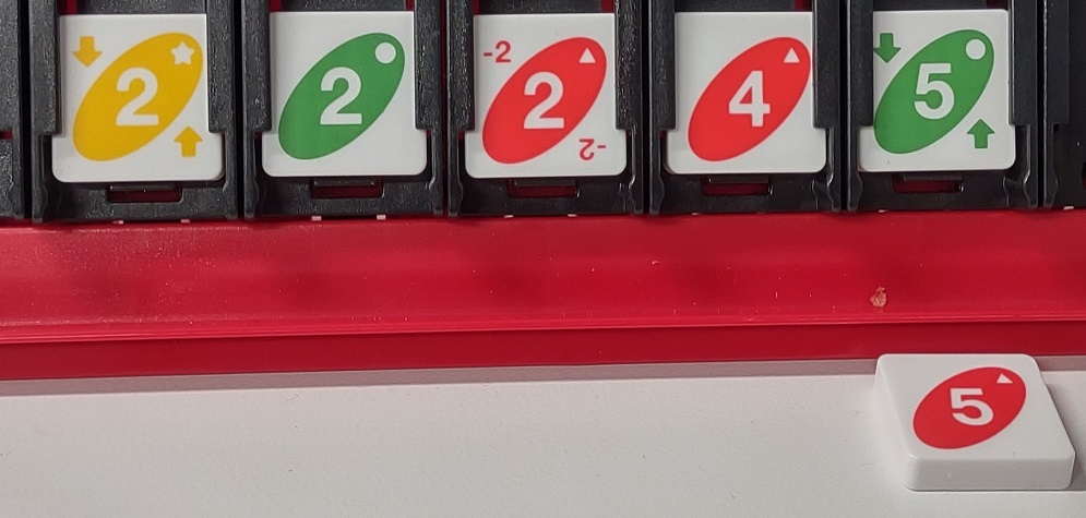 Here are a few plays. Each tile needs to be either next to, in any direction, a tile with the same color or number, or it needs to be placed not touching another tile. Below is a fun move I made. I didn’t have a 2-tile, so I couldn’t win. I had a feeling that my friend had a red, so I played the 5-tile with the push down icon, so I placed it over the red 5-tile. Look what happens in the lower image. It is pushed out the bottom and now my friend’s dream of getting 4 in a row is gone!