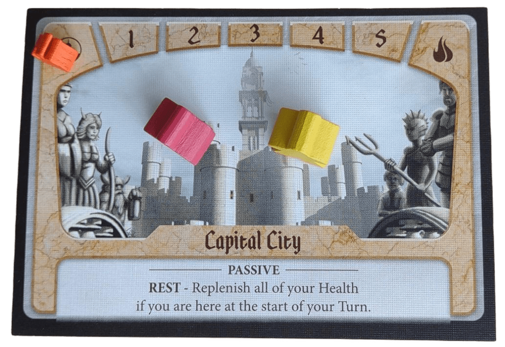 Setup is fairly simple. We placed the Capital City card in the middle of the table, surrounded by the six region cards. Each of us chose a hero and received our corresponding hero card and special abilities. The enemy deck was shuffled and placed next to the board, with the action deck prepared and ready to dictate the flow of the game. We were all set for battle!