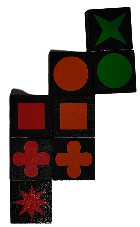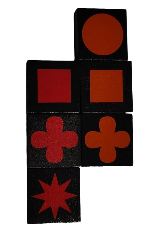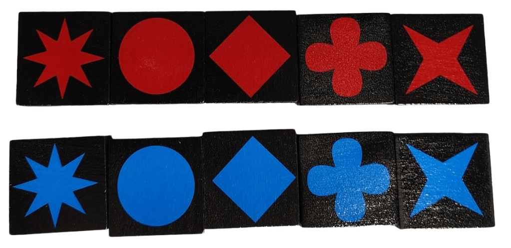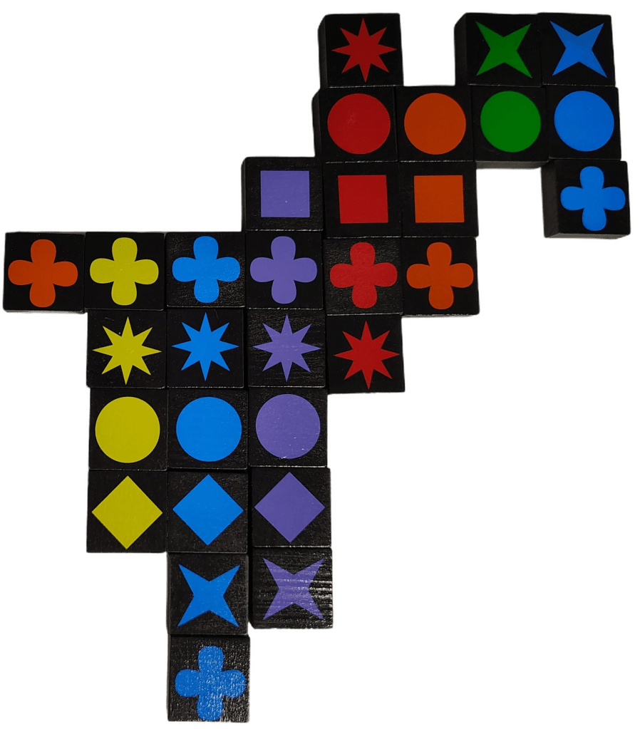 Qwirkle is played with 108 wooden blocks, each marked with six different shapes in six different colors. It comes with a nifty bag, as seen in the photo above. The main aim? To build lines by matching tiles based on either color or shape, scoring points as you go.