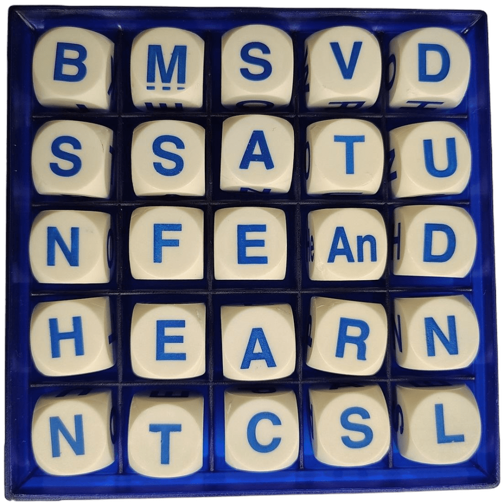 Big Boggle amps up the excitement with a larger grid and more cubes—25 lettered dice to be exact! The game begins with a simple shake of the tray, allowing the dice to settle into a 5×5 grid under a clear cover. And just like that, the stage is set, and the letters are our playground. I actually spent a lot of time building words out of these heavy and large letter cubes.