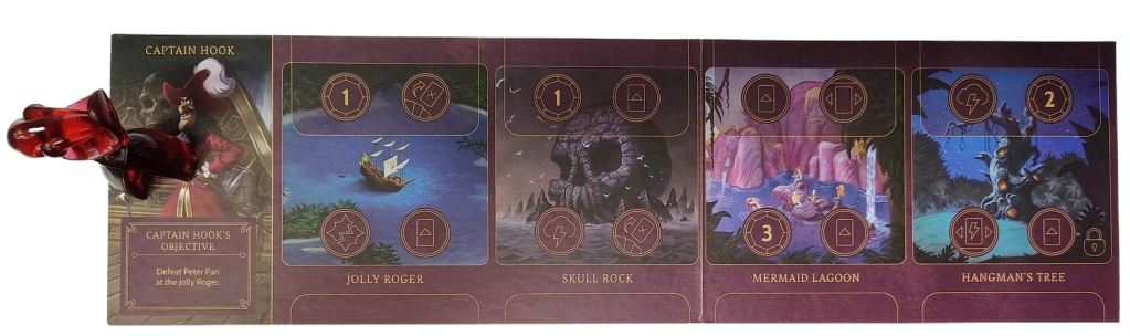 Captain Hook’s journey in Villainous is as daring as it is dangerous, mirroring his legendary escapades in the tales of Neverland. His player board is a vibrant map of this enchanted land, stretching from the shadowy decks of the Jolly Roger to the mystical Mermaid Lagoon. It’s not just a game board; it’s a call to adventure where each location offers strategic depth and narrative richness.