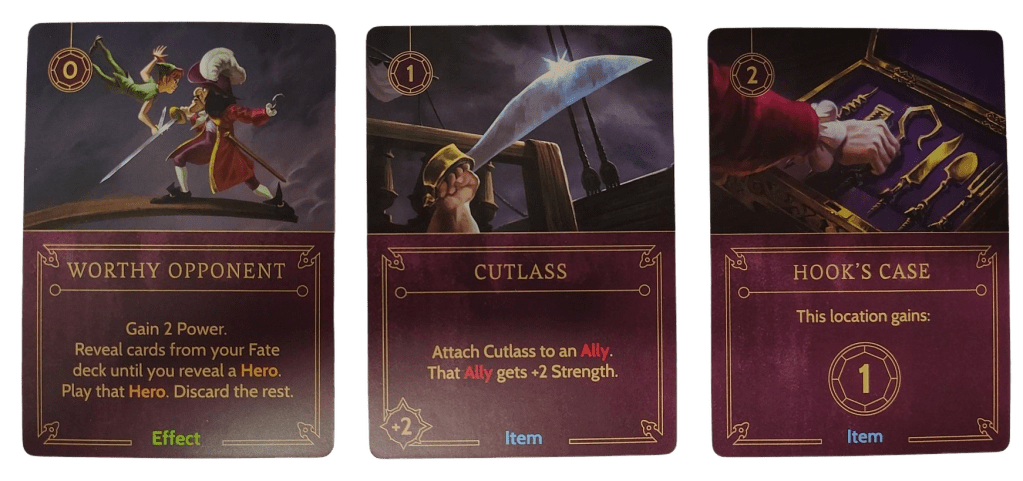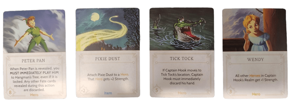 Players must cleverly manage their resources, deploying Hook’s pirate allies and utilizing his unique abilities to take control of the board. Meanwhile, they must also fend off interruptions by Heroes like Peter Pan and Wendy, who pop out of the Fate deck with the sole purpose of thwarting Hook’s piratical plots. I have a few cards above.