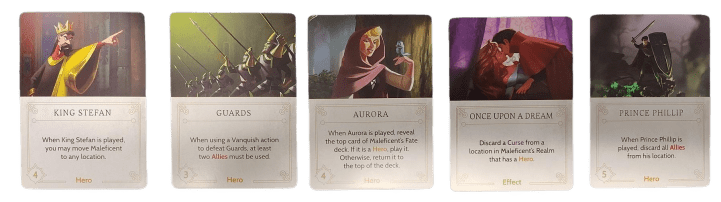 Her Fate deck, which opponents use to thwart her, includes Heroes like Prince Phillip and magical items that can counteract her dark magic. Here are a few of the cards from Maleficent’s Fate deck.