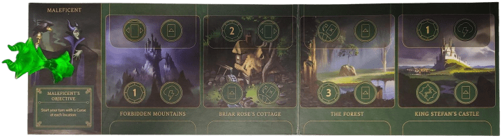 Maleficent’s player board depicts the mystical landscapes over which she reigns, each location offering unique actions that allow her to cast her spells and manipulate her fate.
