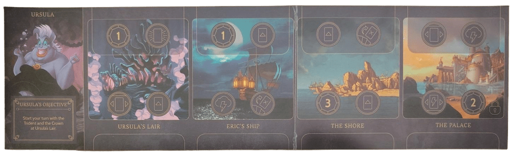 Her player board represents the underwater kingdom, with locations like Ursula’s Lair and the Atlantican throne room. Ursula’s game piece, a beautifully detailed figure of the sea witch, perfectly captures her menacing presence.