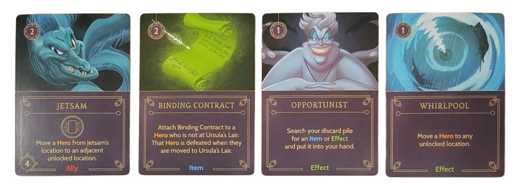 Her Villain deck is replete with dark magic, deceitful contracts, and sea creatures. You can see a few of the cards below.