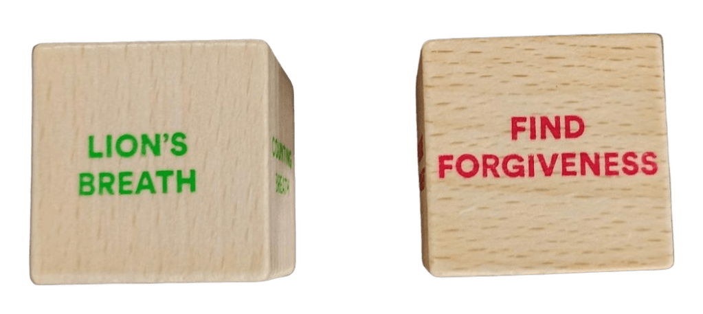 I just rolled Lion’s Breath and Forgiveness, read the prompt and did the activity. The small book gives instructions, if you don’t know what to do. Here are some ways to use the dice: