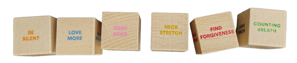 Mindfulness Dice typically come as a set of colorful dice, each with different faces that suggest mindfulness activities or prompts. The sides might include instructions like Open Up, Find Joy, Mindful Breath, Cat/Cow, Be Present and Four Square as shown below.