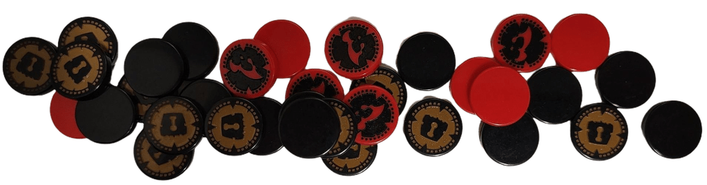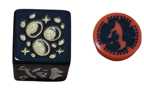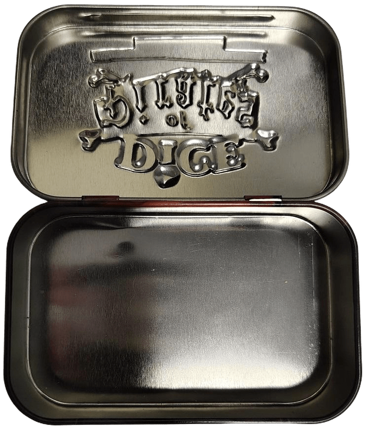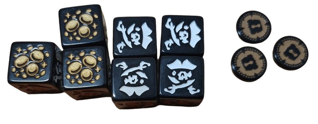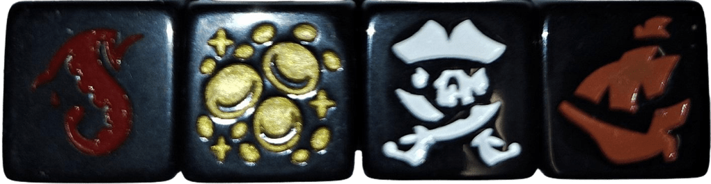 Inside the compact tin, you’ll find eight custom dice adorned with pirate symbols: gold coins, black flags, ships, and crossbones. There’s also a cluster of treasure tokens—glittering booty that every player is dying (or should I say rolling) to collect. The art is charming and evokes the spirit of a Saturday morning pirate adventure. Here are the 4 different types of dice.