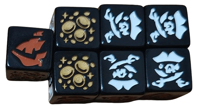 On your turn, you’ll roll all eight dice, and each symbol holds a fate of its own. Roll a Gold Coin, and you’ve struck treasure—hoard these gleaming prizes for points at the end. Land on a Black Flag, and you’ll need to set it aside; collect too many, and you’ll find yourself under attack! If you roll Ships, it’s time to raid, plundering treasure from your fellow players (because what kind of pirate would you be without a little plundering?).