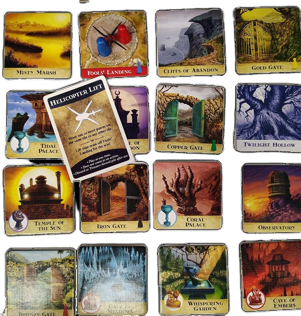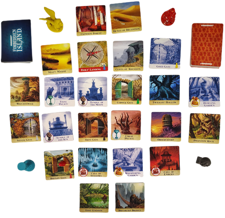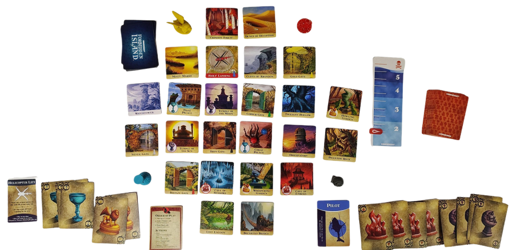 The moment I opened the box, I was drawn into the world of lost relics and ancient ruins. Inside, I found a set of beautifully illustrated island tiles, a deck of Treasure Cards, a set of Flood Cards, adventurer pawns, and, of course, the legendary four treasures—The Earth Stone, The Statue of the Wind, The Ocean’s Chalice and The Crystal of Fire.
