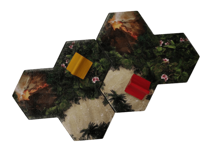 Here’s how our adventure unfolds: On your turn, you’ll draw and place a terrain tile, each action altering the island’s topography. These tiles stack, creating majestic mountains and sprawling lands. The strategic twist? You must always place a tile adjacent to a volcano, simulating the natural growth and catastrophic changes of our island.